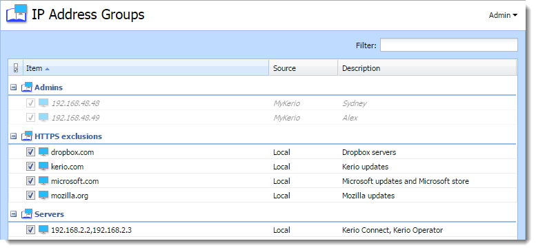 اگر شما برنامه های متعدد Kerio Control دارید، می توانید آنها را در MyKerio مدیریت کنید و گروه های آدرس IP به اشتراک گذاشته شده در سراسر همه برنامه های خوداستفاده کنید. همه گروه های آدرس IP به اشتراک گذاشته شده به عنوان MyKerio برچسب زده شده اند و همه گروه ها اضافه شده در برنامه ها به عنوان Local در ستونSource برچسب شده اند